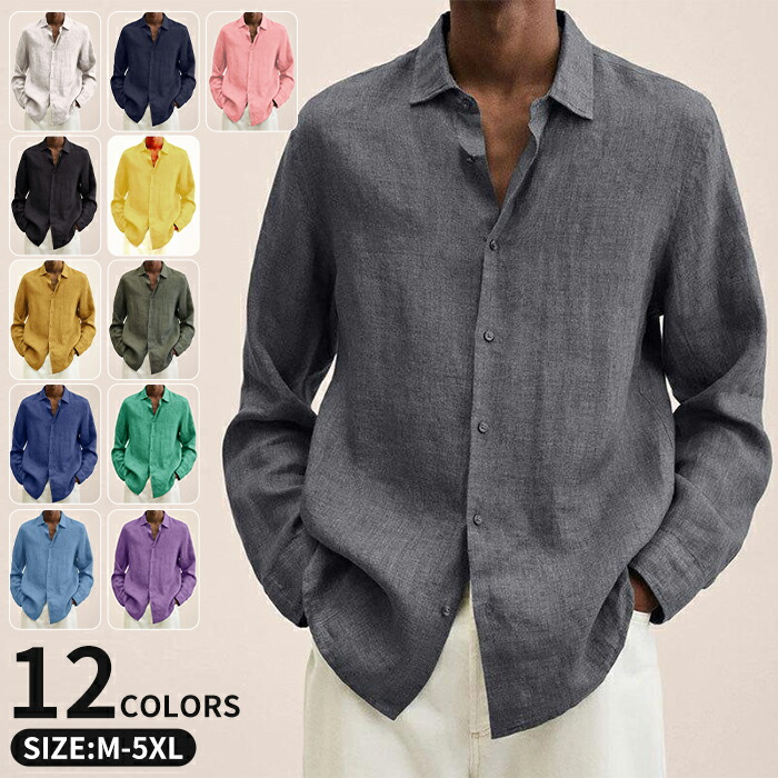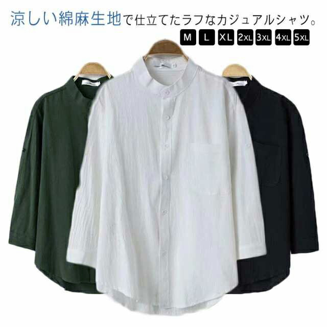 シャツ メンズ 綿シャツ リネンシャツ 麻 リネン 夏 長袖 七分袖 綿tシャツ 立ち襟 カジュアル 男性用 お兄系 無地 秋 通勤 通学 ホワイト ネイビー ピンク イエロー グレー カー ブラック