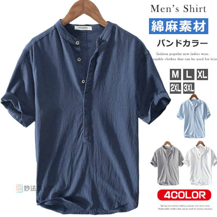 綿麻 シャツ リネンシャツ メンズ バンドカラー プルオーバー 半袖シャツ カジュアルシャツ ボタンシャツ スキッパーシャツ コットンリネン 薄手 爽やか シ ナチュラル