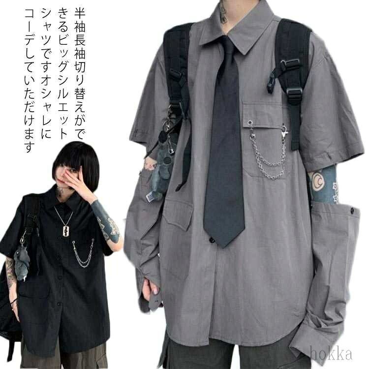メンズ 薄手 ステージ衣装 半袖長袖切り替え ビッグシルエットシャツ 飾りチェーン 男女兼用 韓国ファッション トップス ネクタイ付き