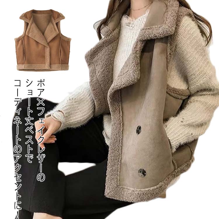 袖なし ショートベスト レザー カジュアル フェイクスエード ベスト 秋冬 前開き ジレ ボアベスト 大きいサイズ ノースリーブ ボアブルゾン ゆったり レディース 暖かい 羽織り 体型カバ アウター