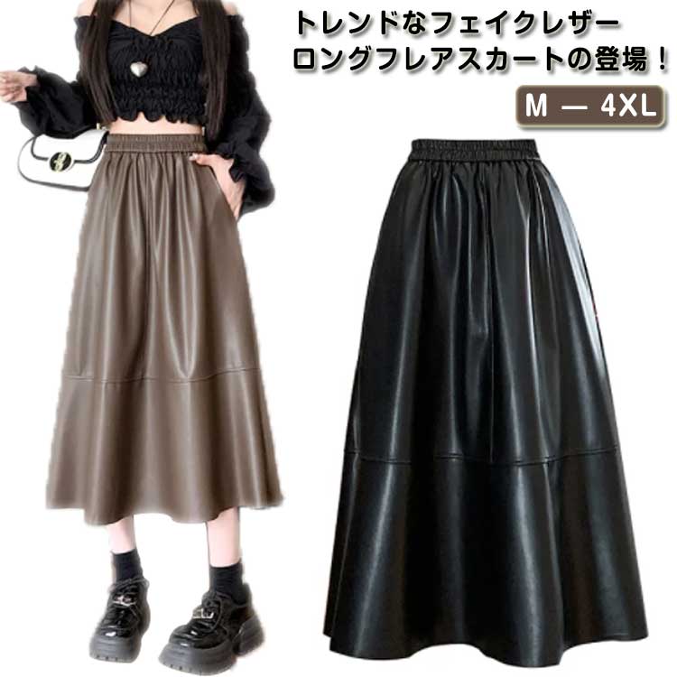 オフィスカジュアル ボトムス フェイクレザー 大人 PUレザー レディース フレアスカート スカート ロングスカート Aライン レザースカート 秋冬 秋服 20代 ハイウエスト