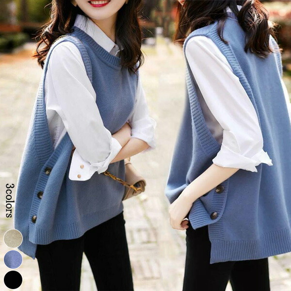 2A17 サイドボタン ニットベスト 3つボタンニットベスト 両サイド ボタン付き ベスト ニットレディース ニット 春 夏 秋 可愛いベスト