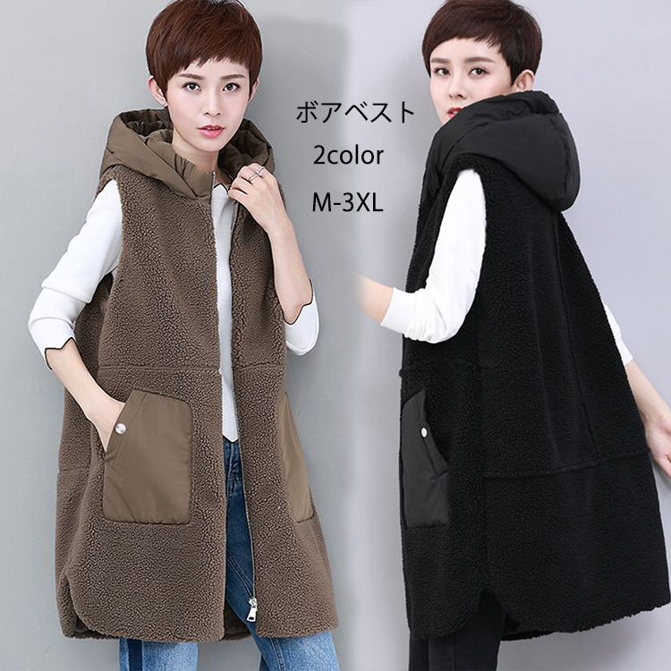 レディース ボアベスト ロング丈 フード付き トップス ベスト ノースリーブ もこもこ 防寒 暖かい フリースベスト ノーカラー アウター 通勤 カジュアル 厚手