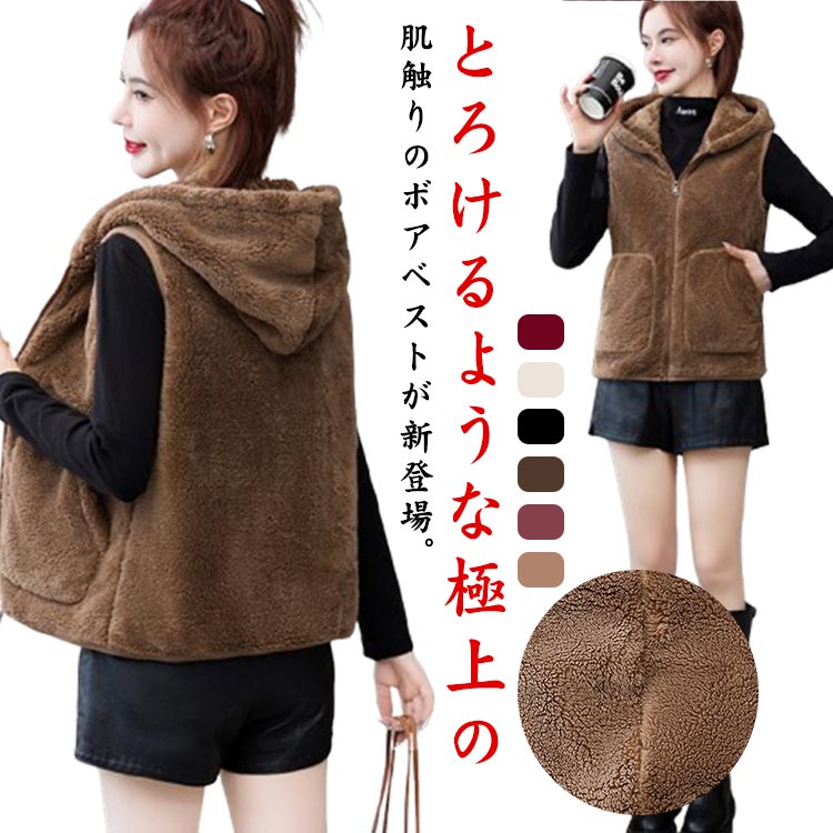 フード付き ボアジャケット ボアベスト レディース ボア ベスト フリース ノースリーブ トップス アウター スタンドカラー 羽織り 前開き パーカー ジップアップ 厚手 暖かい あ 袖なし