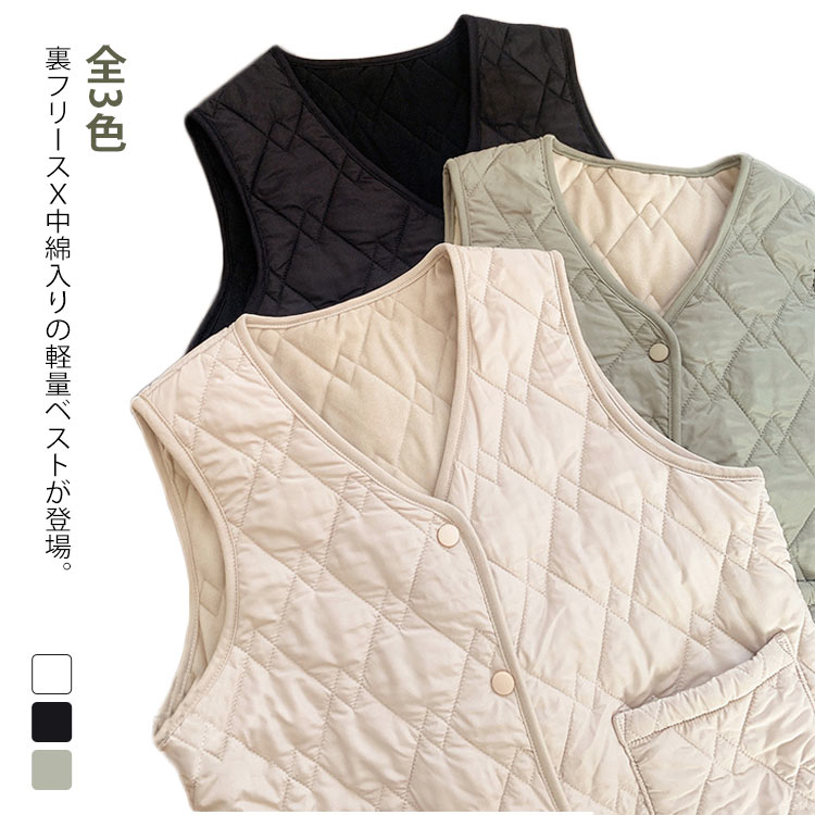 レディース 薄手 全3色 裏フリース ダウンベスト 女の子 秋 春 インナーダウン 冬 ベスト Vネック ノーカラー ライトダウン 重ね着 防寒 軽量 ブラック ベージュ ホワイ 防寒着