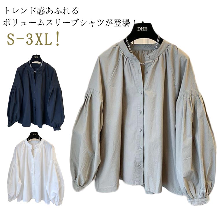 シャツブラウス 長袖 ボリュームスリーブ 春秋 トップス シャツ レディース ルーン袖 オーバーサイズ 体型カバー バンドカラー 大きいサイズ ゆったり シンプル おしゃれ カジュアル きれいめ 無地