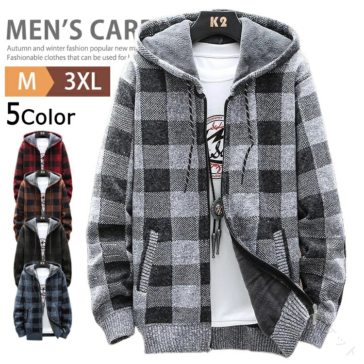 ニットカーディガン 厚手裏起毛 メンズニットセーター チェック柄パーカー 防寒アウター おしゃれジャケット 軽量暖かい ボアジップアップ カジュアル羽織り 秋冬コーーデ