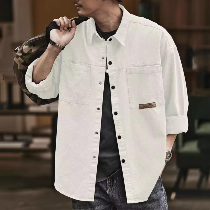 シャツ メンズ 春秋 長袖 ゆったり カジュアル ワーク アイボリー 厚手 アメリカンスタイル フィット 普段使い オフホワイト トップス