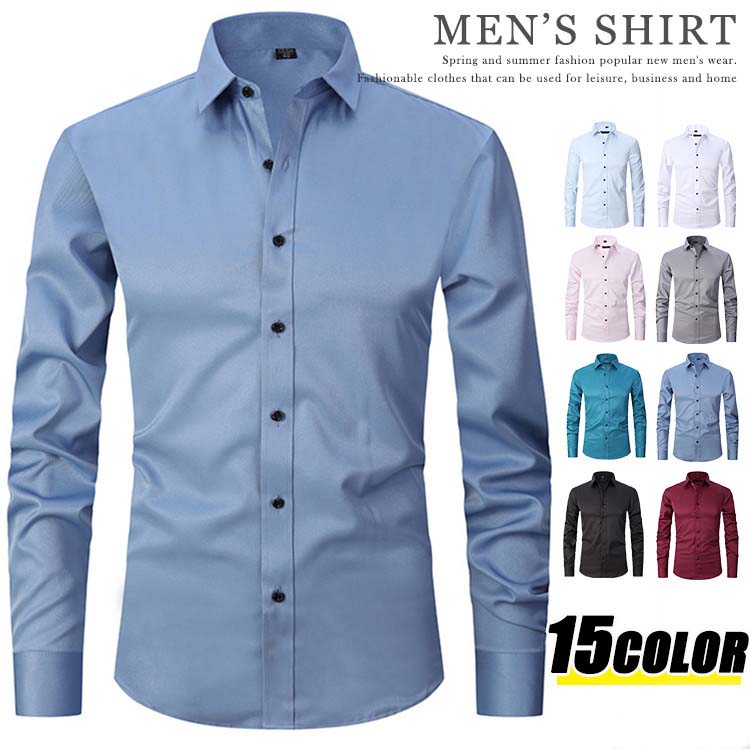 ワイシャツ ストレッチ 超伸縮 メンズ シャツ ノーアイロン 長袖 スリムシャツ かっこいい 着痩せ ビジネス フォーマル 無地 シンプル カジュアル 爽やか 春 秋 新作 黒 黄 緑 青 灰 ワ 紫