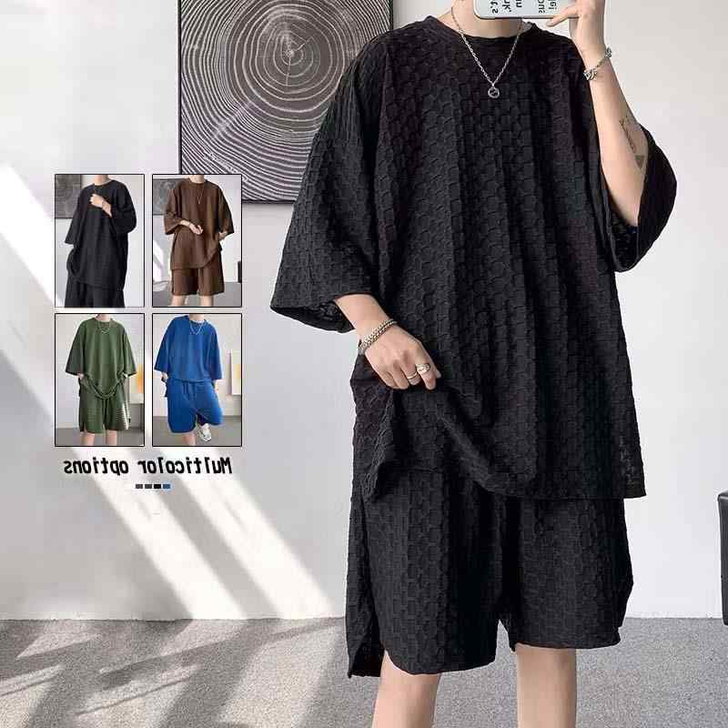 上下セット メンズ 夏 通勤 カジュアル ゆったりとしたシルエット 接触冷感 半袖Tシャツ ショートパンツ 2点セット プリーツ加工
