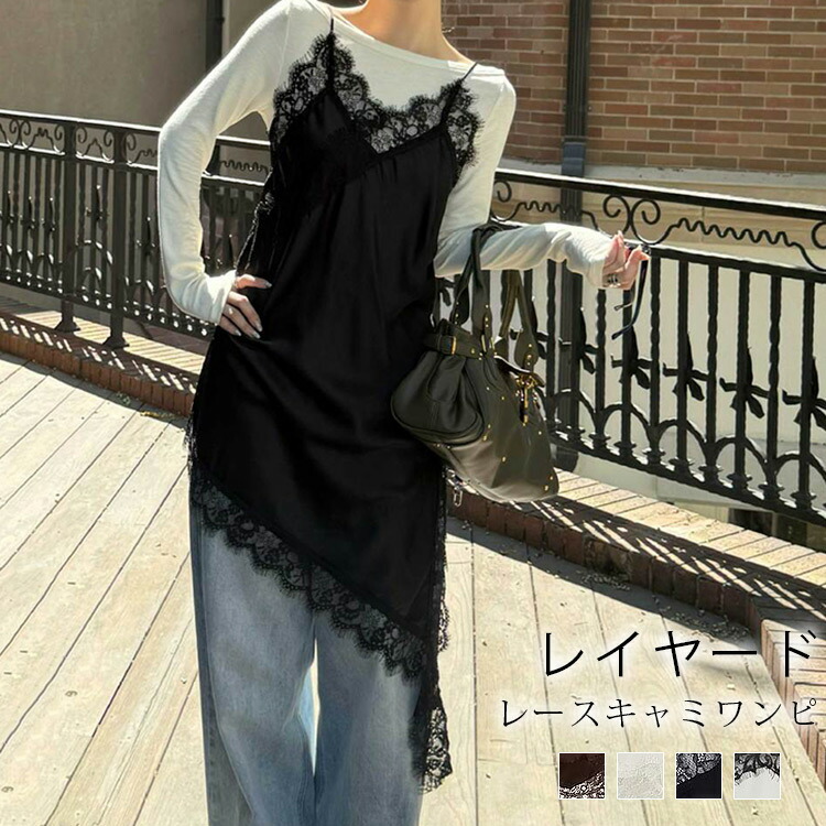 レース サテンレース 春 夏 秋 アシメ キャミ ロングキャミソール キャミソール サテン レースキャミ サテンキャミ アシンメトリー レイヤード 重ね着 丈長め トレンド 流 チュニック丈