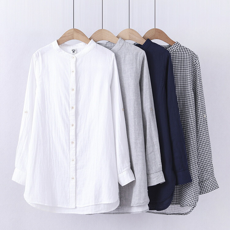 シャツ レディース 白シャツ チュニック 春 長袖シャツ ブラウス トップス シャツブラウス ガーゼシャツ ガーゼ 長袖チュニック 立ち襟 2層ガーゼ 柔らか ロールアップ カジュアル 綿1 ロング丈