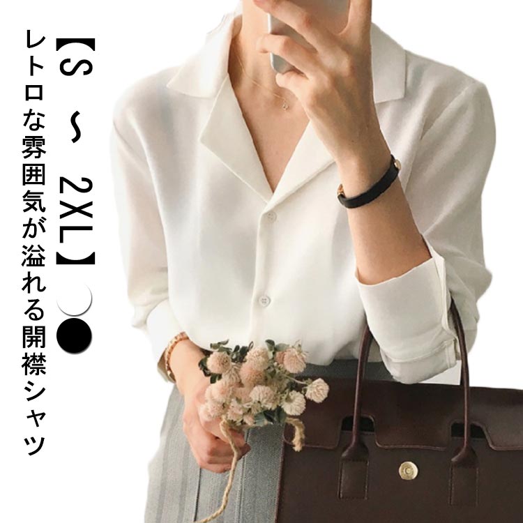 ブラウス レトロ シャツ レディース 長袖 開襟シャツ オフィス ~ 白 大きいサイズ S 開襟 2XL トップス Vネック オープンカラー 事務服 カジュアル 春 夏 お仕事