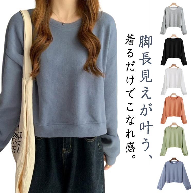 短め丈で脚長効果抜群 スエット トップス クルーネック ショート丈 トレーナー パーカー おしゃれ デート お出かけ こなれ