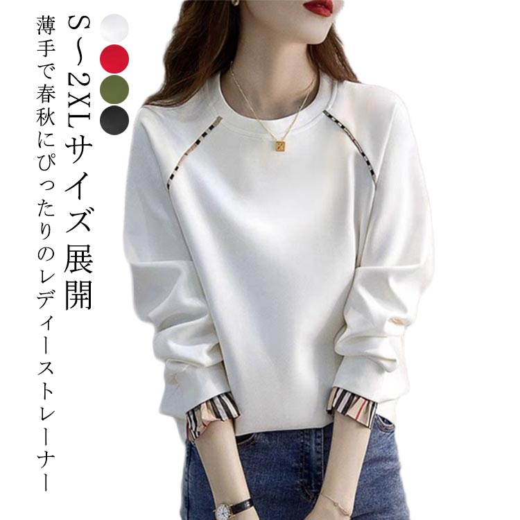 トレーナー スウェット レディース クルーネック 薄手 春秋用 秋冬用 無地 ラウンドネック 長袖 プルオーバー ゆったり カジュアル フェイクレイヤード 大人可愛い ナチュラル 部屋着 学 トップス