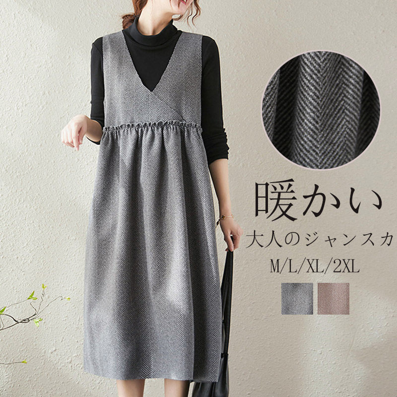 ロングワンピース 秋 冬 きれいめ ジャンパースカート 大人 ロング vネック ワンピース 大きいサイズ ジャンスカ 秋冬 おしゃれ 微起毛 ウール調 防寒 あったか 切り替え フリル 無地 暖かい