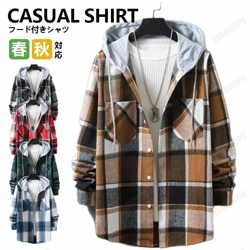 シャツ ライトジャケット 通勤 はおり ネルシャツ トップス 長袖シャツ フード付きシャツ 春秋 メンズ チェックシャツ シャツジャケット カジュアルシャツ