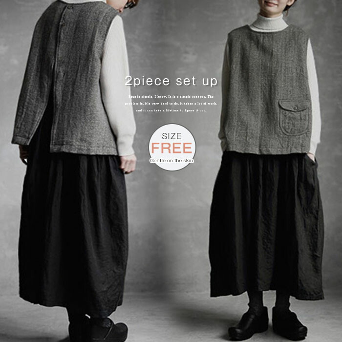 セットアップ レディース ベスト+スカート 2点セット ベスト 袖なし トップス バックスリット 後ろボタン スカート ロングスカート ボトムス ゆったり