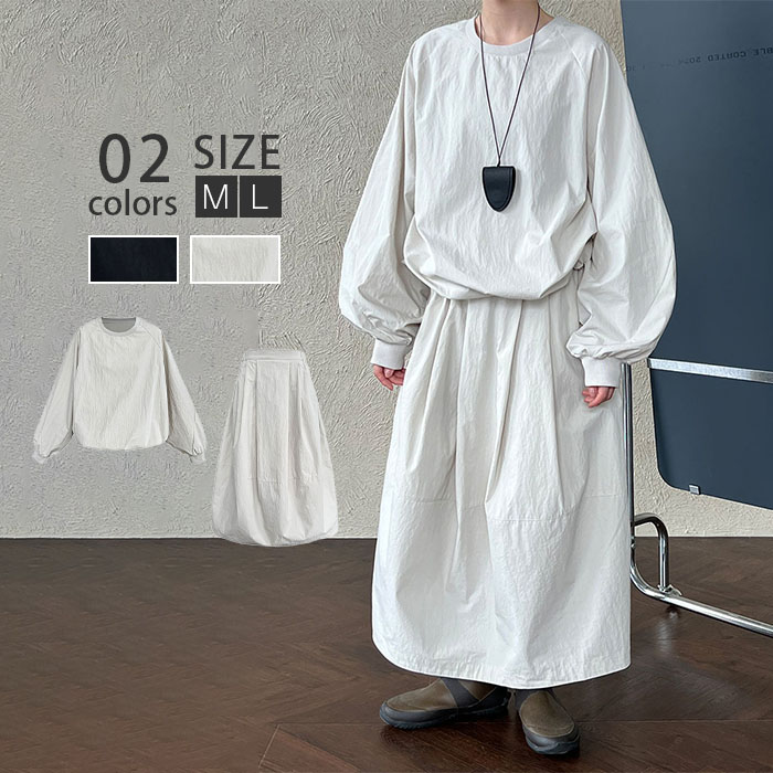 セットアップ レディース スカートスーツ 2点セット パーカー 長袖 クルーネック 裾ゴム ロングスカート ロング丈 綿混 ウエストゴム 上下セット シンプル ゆったり 体型カバー 大 無地