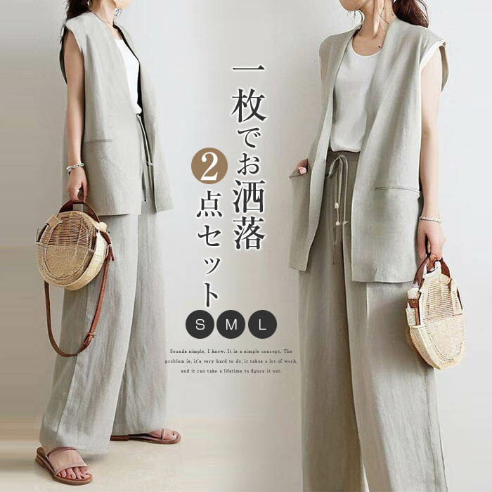 セットアップ ジレ ベスト レディース ベストスーツ パンツスーツ 2点セット ジレ セットアップ コットン 上下セットアップ カジュアル ワイドパンツ 春 夏 レイヤード風 重ね着