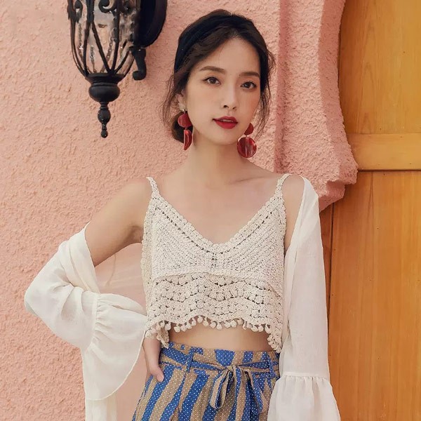 キャミソール クロシェ編み ビスチェ ニット サマーニット タンクトップ ショート ニットベス 手作り トップス エスニック ボヘミア風 ボヘミアン おしゃれ 日常可 カジュアル 旅行 肩出しニット