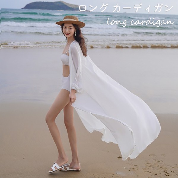 水着の上に着る ガウン シフォン ロングガウン ロングカーディガン ノーボタン シフォンガウン 白 ロング 透け感 レディース おしゃれ トップス 大人 女性 海 ビーチ シアートップス 春 プール