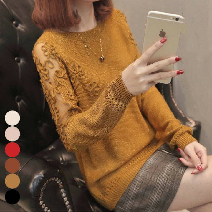 レース切り替え セーター レディース トップス 長袖 ラウンドネック リブ編み ニットトップス お洒落 ニットセーター