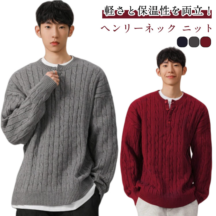 防寒 長袖 秋 ケーブル編み ニットプルオーバー ヘンリーネック 冬 クルーネック トップス ニット 暖かい 保温 ニットセーター メンズ セーター ゆったり オーバーサ プルオーバー