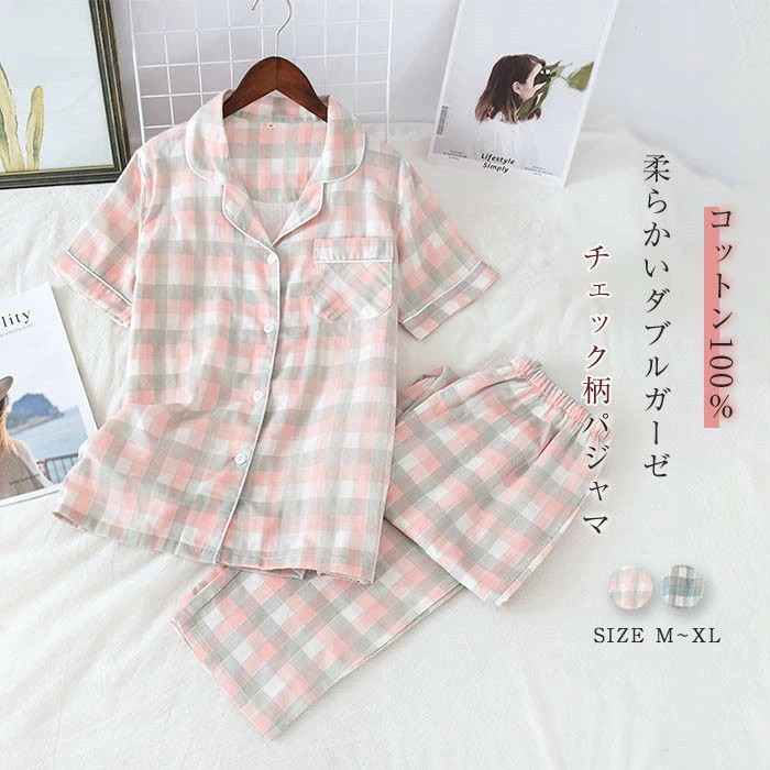 ガーゼ パジャマ レディース ルームウェア 夏 半袖 チェック柄 部屋着 セットアップ 2点セット 寝間着 寝巻き 上下セット 前開き 快適 大きいサイズ ダブルガーゼ