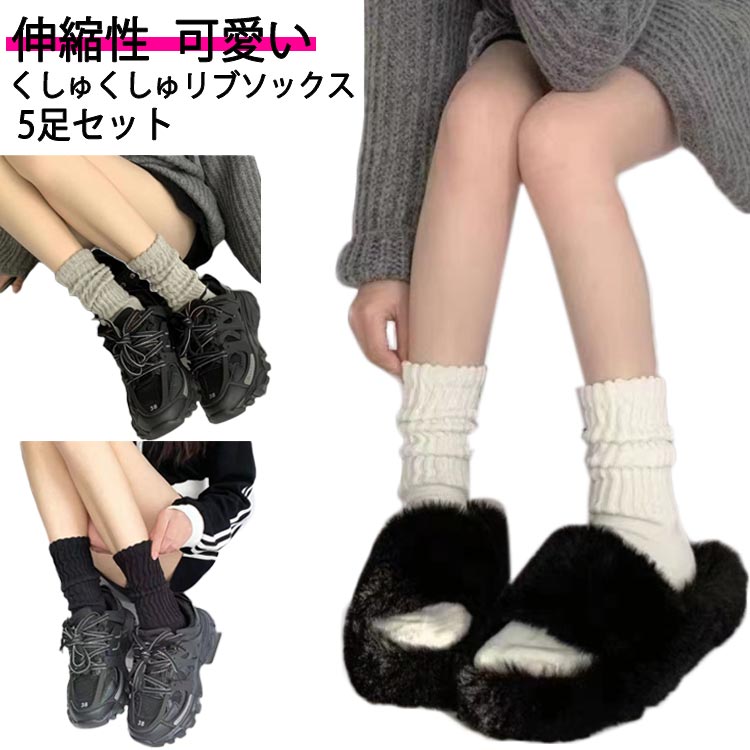 レディース スクール くしゅくしゅ リブソックス 5足セット 靴下 ルーズソックス 女性用 黒 グレー 仮装 女子高生 コスプレ ロング かわいい 春夏 オールシーズン 白 伸縮 秋冬