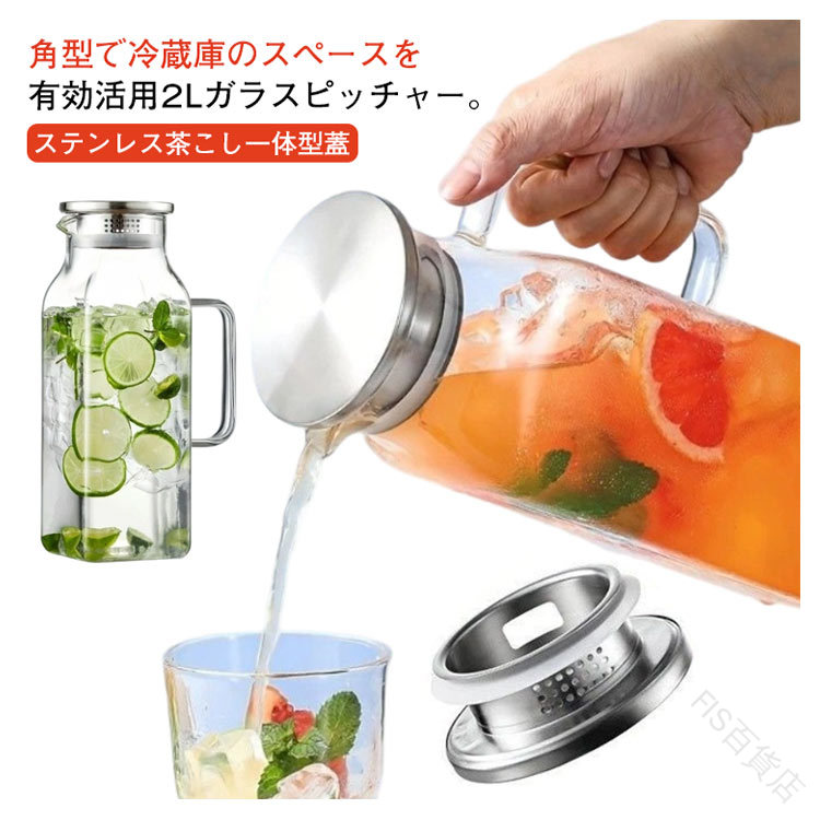 茶こし付き 冷水筒 2リットル スクエア 冷水筒 冷水ポット 2 耐熱ガラス ピッチャー 麦茶 冷茶 ポット 広口 洗いやすい ステンレス茶こし一体型蓋 ティーポット ガラスピッチャー
