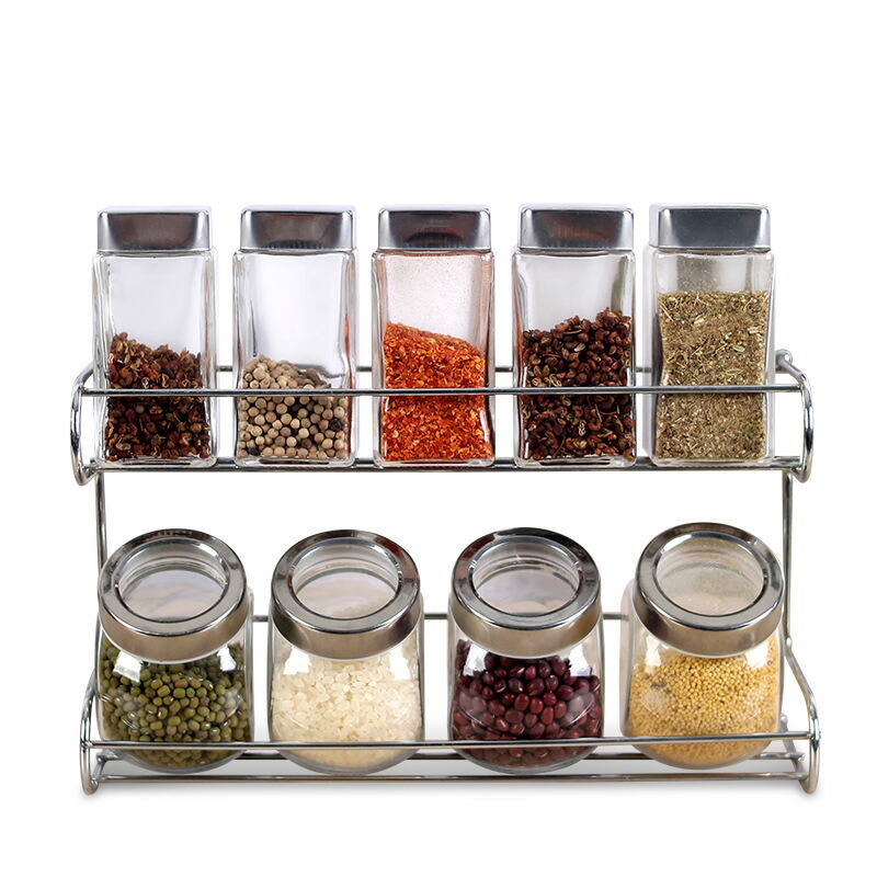 収納 調味料 スパイスラック セット ガラス 瓶 家庭用2段 9個 台所デスクトップ 調味料入れおしゃれ