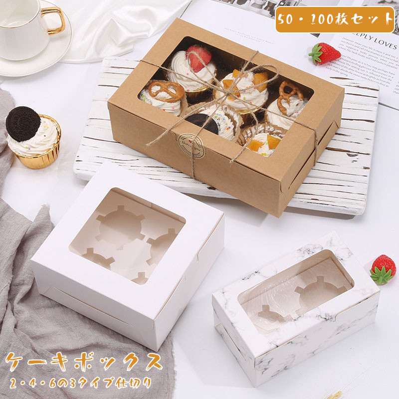 ケーキボックス 50枚 100枚セット カップケーキボックス 窓付き 2仕切り 4仕切り 6仕切り ケーキ箱 箱 タルトボックス ギフトボックス お菓子箱 マフィンカップ タルト プリン カップケーキ
