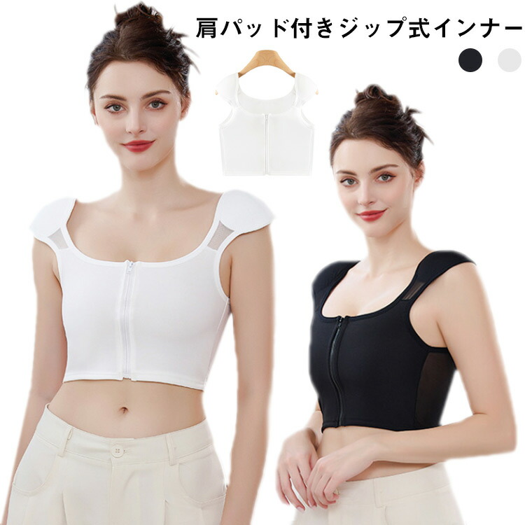 肩パッド付き インナーウェア レディース ジップ式 アイスシルク素材 涼感 吸汗 速乾 シャツ 補正下着 フレンチスリーブ Uネック 胸を小さく見せる 肩対策 コスプレ