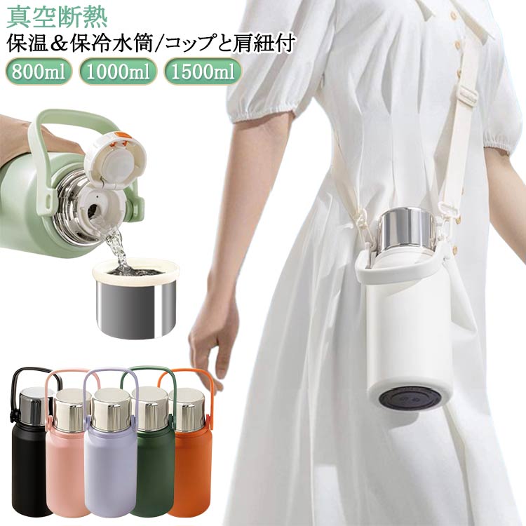 ショルダー付き 1L 800ml 1500ml マグボトル 水筒 1000ml 真空断熱 コップ付き 真空ボトル 1.5L 持ち手 茶こし付き ス ショルダーストラップ付