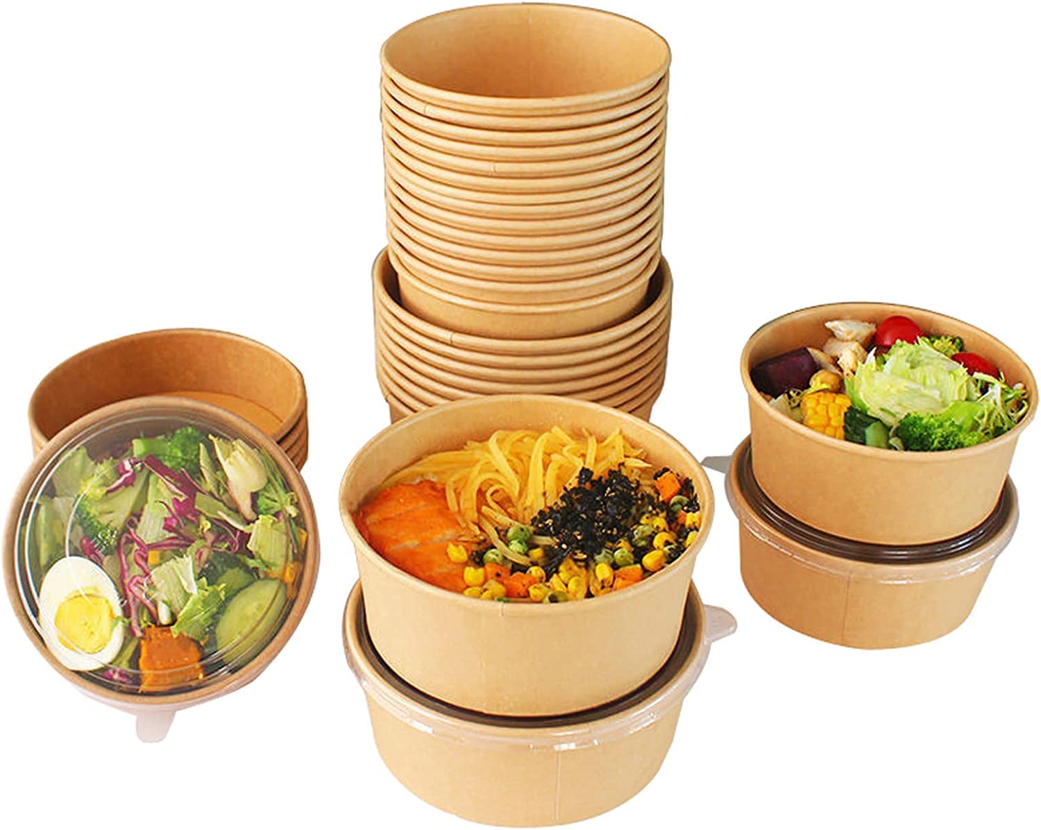 使い捨て弁当箱 ペーパーボウル クラフト紙ボウル 食品グレード 環境にやさしい 分解性ラウンド 蓋付き 電子レンジ対応 持ち帰り用 サラダ ナッツ スナック ゼリーボール フルーツ チリ キャンディー