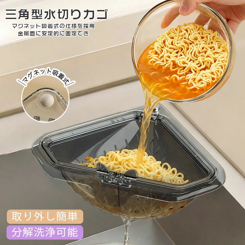 三角水切りカゴ マグネット固定式 水切りラック 三角コーナー シンクサイド収納ラック 防臭メッシュ付き 残渣フィルター 調理後片付け簡単 省設計 生ゴミ処理 分解洗浄可能 現代モダン 水切りバスケット