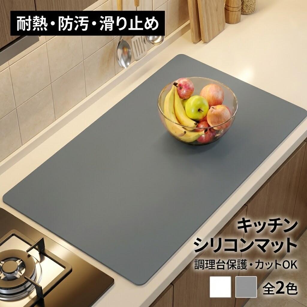 耐熱・防水仕様で調理台やカウンターをしっかり保護。滑り止め付きで安定感抜群。汚れてもサッと拭けるシリコンマットでキッチンをいつも清潔に