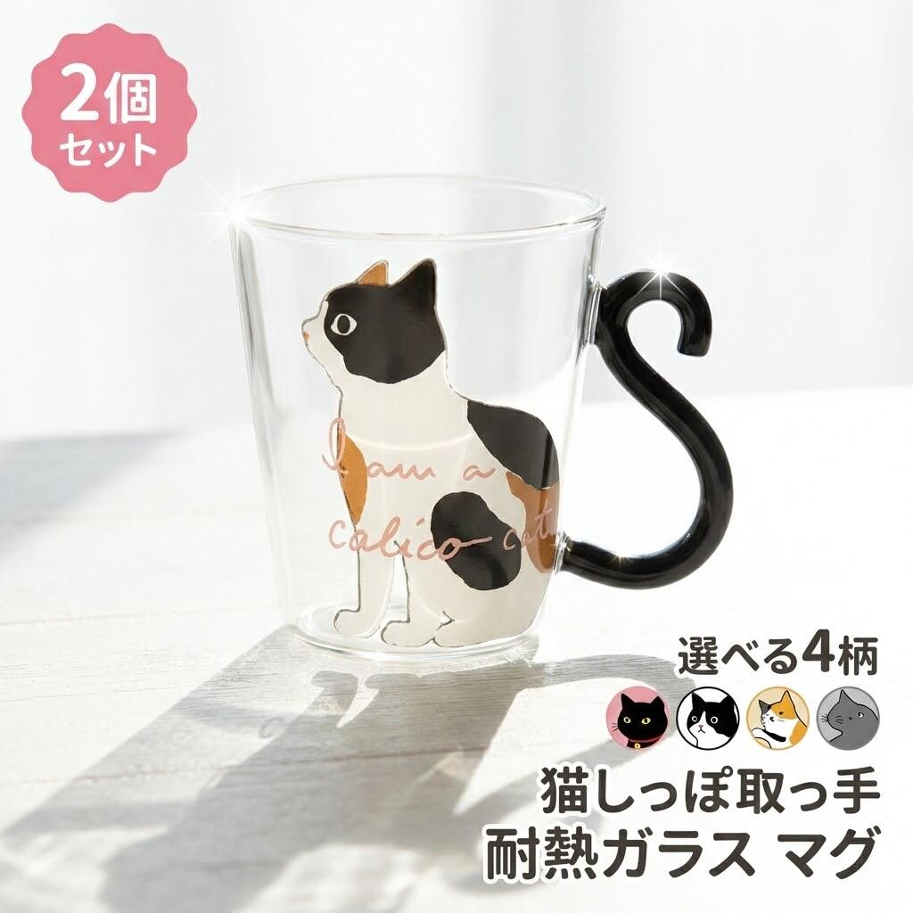 【自由に組み合せ可能!】2個セット 耐熱ガラス マグカップ 猫柄 ギフト プレゼント クリア