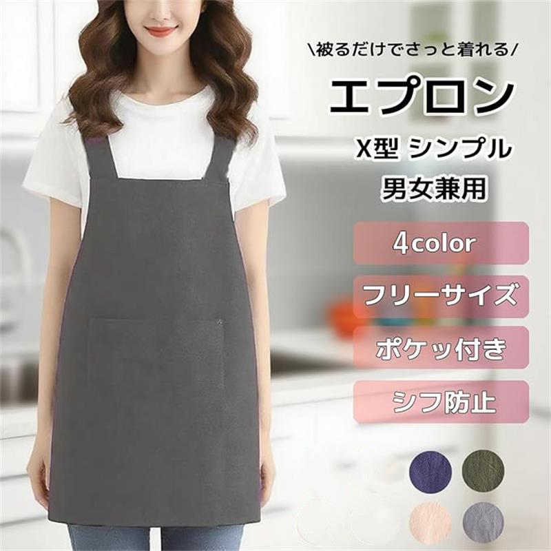 エプロン おしゃれ かぶり かぶるだけ メンズ レディース 北欧 無地 バッククロス X型 大容量ポケット 綿100%のしわ加工生地で 男女兼用 ワンピースエプロン