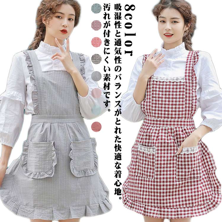 フリルが可愛い メイド風 エプロン ひらひら フリル ワンピース風 清楚でかわいい 新婚さん 全6色 カフェエプロン