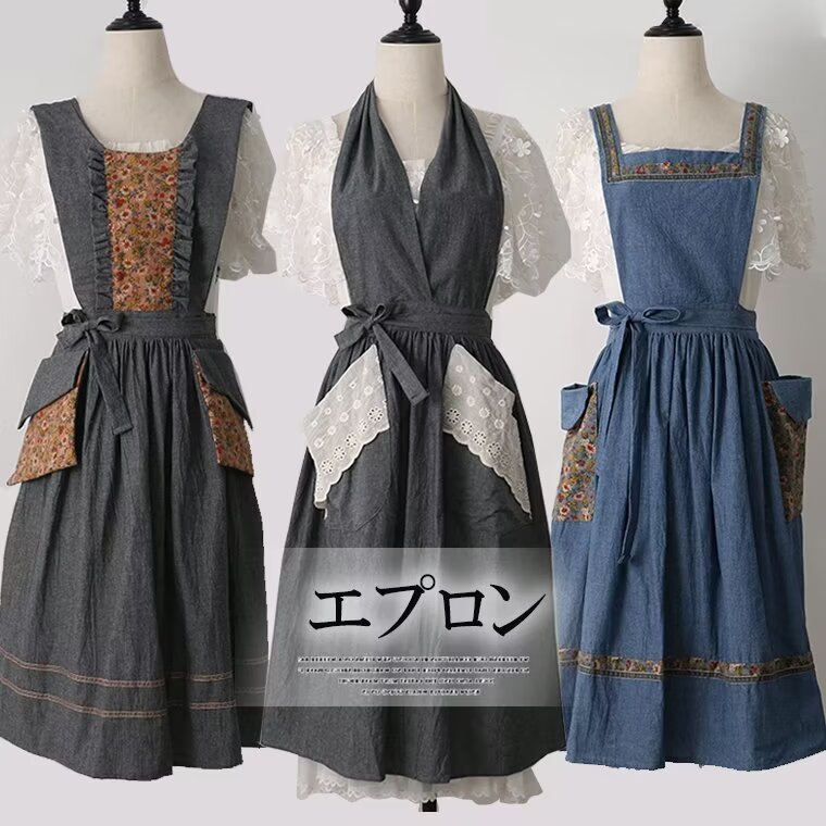 大人かわいい雰囲気を引き立てます 選べる3種類 デニム風 エプロン ポケット付き花柄 レース 切替 型 キャンプエプロン ワンピース風 アウトドア 料理教室 保育士 キッチンサロン オシャレ業務用