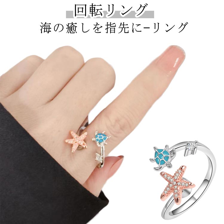 ヒトデ オープンリング ウミガメ 回転リング 可動ランナー ストレス解消リング アンストレス 不安リング 調節可能 かわいい 女性用 誕生日 ギフト おしゃれ