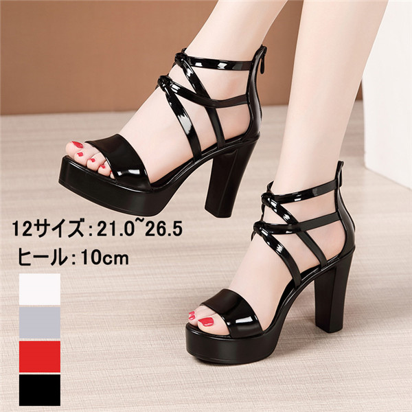 厚底サンダル レディース ストラップ ハイヒール 太ヒール ストーム付き ヒール10cm 美脚 走れる 大きいサイズ 小さいサイズ 歩きやすい 黒 白 赤 21.0cm~26.5cm 4色展開 ベ 銀