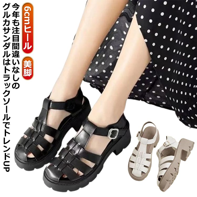 通学 トラックソール グルカ 6cmヒール 厚底 編み込みサンダル 軽い 前詰まり レディース 歩きやすい ストラップサンダル 疲れない 軽量 カジュアル おしゃれ 白 ブラック 黒 ホワイ サンダル
