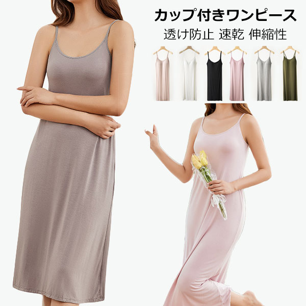 カップ付きワンピース インナードレス インナーキャミソール ペチコート ワンピース キャミワンピ ロング スリップ 透け防止 速乾 伸縮性 夏 部屋着 定番 シンプル 夏服 無地
