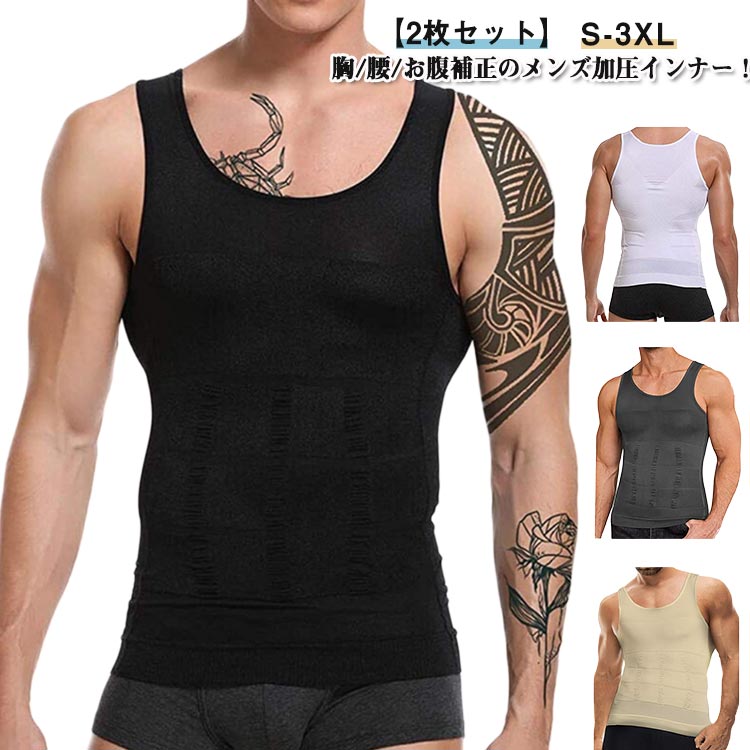 送料無料 加圧インナー メンズ 加圧シャツ タンクトップ 2点セット ノースリーブ 加圧タンクトップ 筋トレ ダイエット 下腹部も引き締める 補整