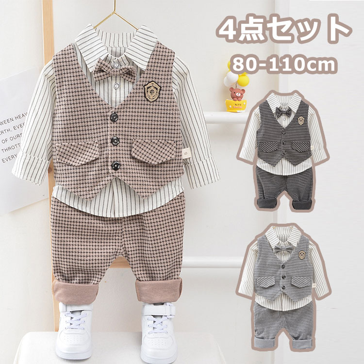 子供服 ベビー スーツ キッズ フォーマル ブレザー 男の子 ベビー服 4点セット 蝶ネクタイ付き シャツ ベスト パンツ 卒園式 入園式 お宮参り チェック柄 タキシード風 七五三
