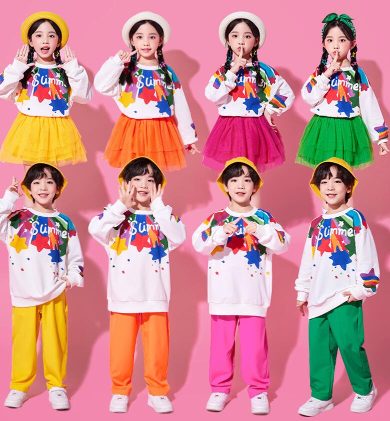 子供ダンス衣装 女の子 男の子長袖tシャツスター柄ロング丈パンツ チュールスカートチアガールヒップホップジャズダンスセット活躍運動会普段着幼稚園服舞台演出服春夏popping