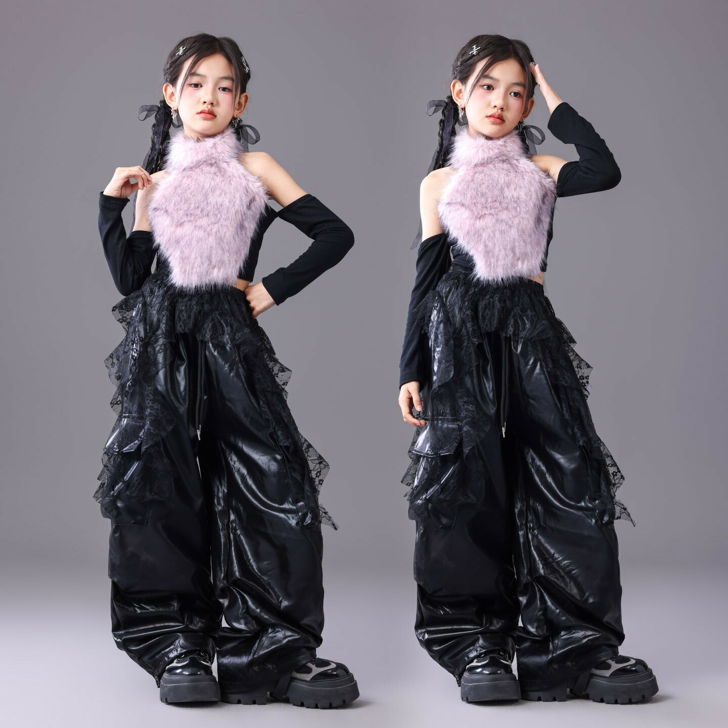女の子 切り替えトップス もこもこ ホルターネック オフショルター 紫x黒 ジャズダンス衣装 レザーパンツ 長袖 ロングパンツセット 腰飾り ドラム演出服 団体服 普段着 発表会 運動会 h イベント